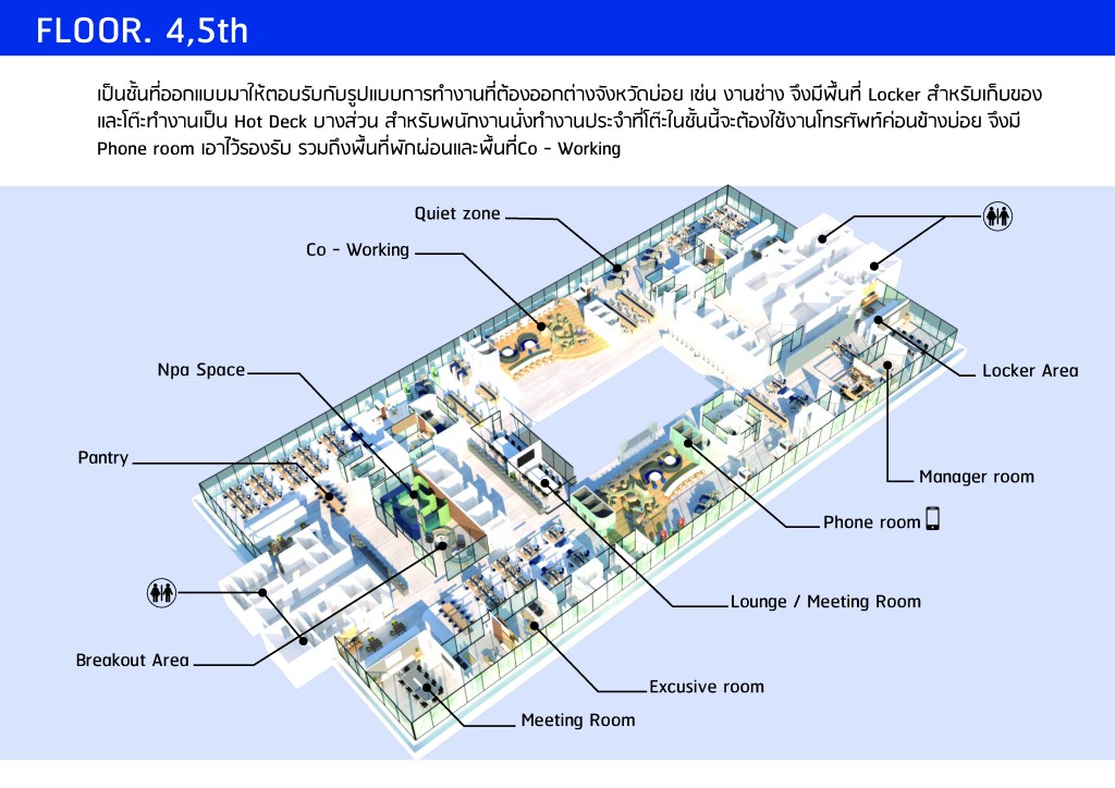 This is how the 4th year students of Workplace Design Studio at Thammasat Design School visualize workplace transformation at TOT headquarter.
