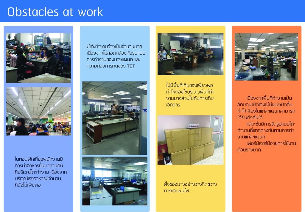 ผลงานชิ้นสุดท้ายของนักศึกษาปี 4 กลุ่ม Workplace Design Studio แสดงถึงการวิเคราะห์การใช้งานพื้นที่ และนำเสนอการปรับปรุงพื้นที่อาคารสำนักงาน บริษัททีโอที แจ้งวัฒนะ