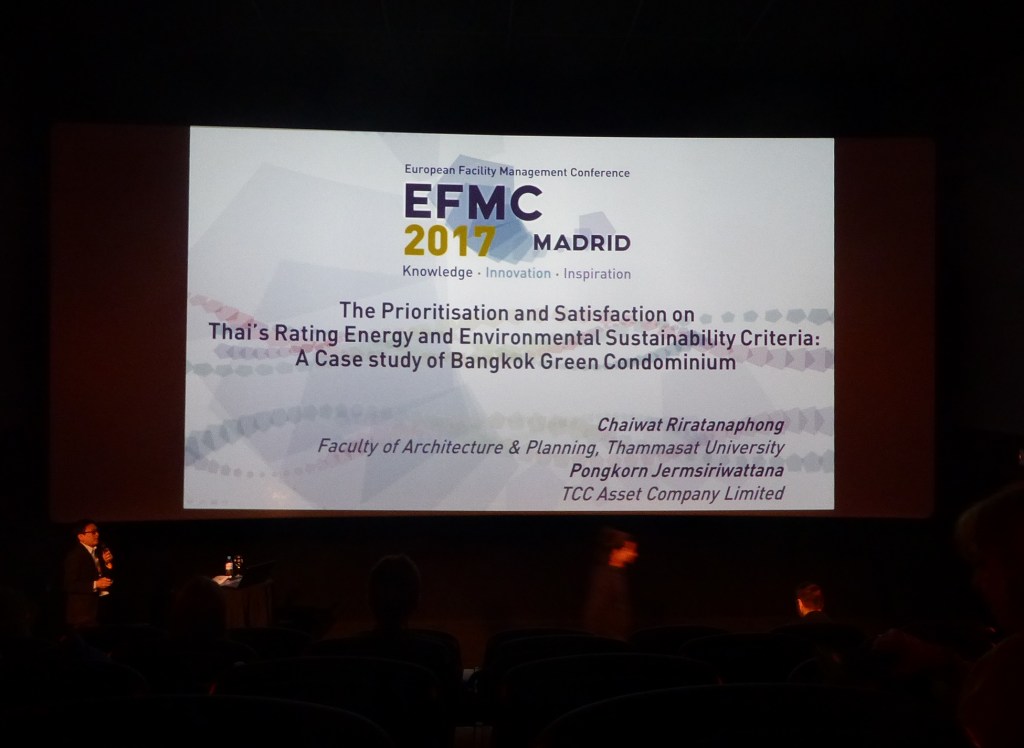 A research paper entitled “The prioritisation and satisfaction on Thai’s Rating Energy and Environmental Sustainability Criteria: A Case study of Bangkok Green Condominium” was presented in The European Facility Management Conference 2017 Madrid, Spain.