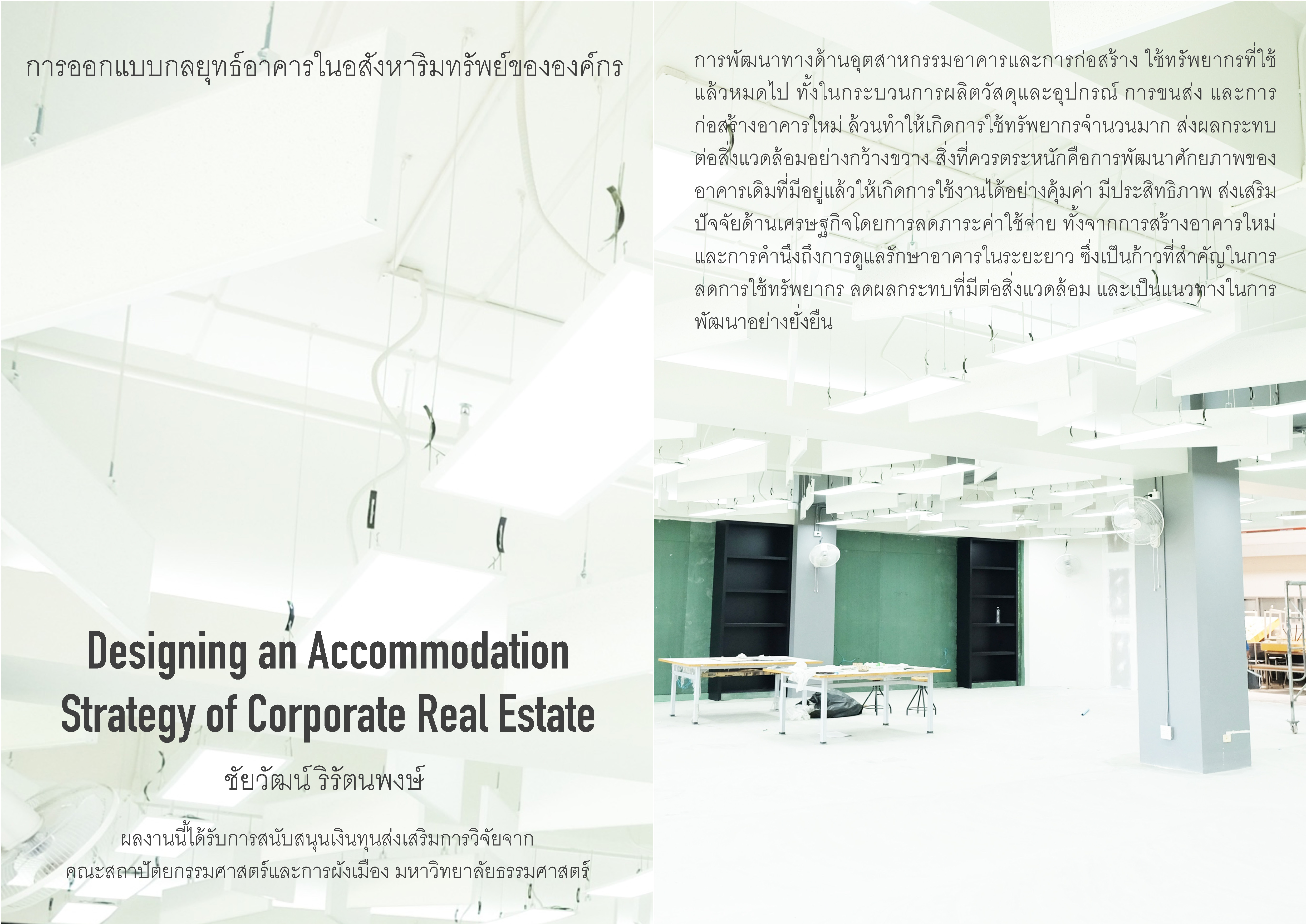 รายงานการศึกษาเรื่อง การออกแบบกลยุทธ์อาคารในอสังหาริมทรัพย์ขององค์กร เสร็จสมบูรณ์และเสนอต่อคณะสถาปัตยกรรมศาสตร์และการผังเมือง มหาวิทยาลัยธรรมศาสตร์ และจะได้รับการปรับเป็นบทความวิชาการเพื่อเผยแพร่ต่อไป