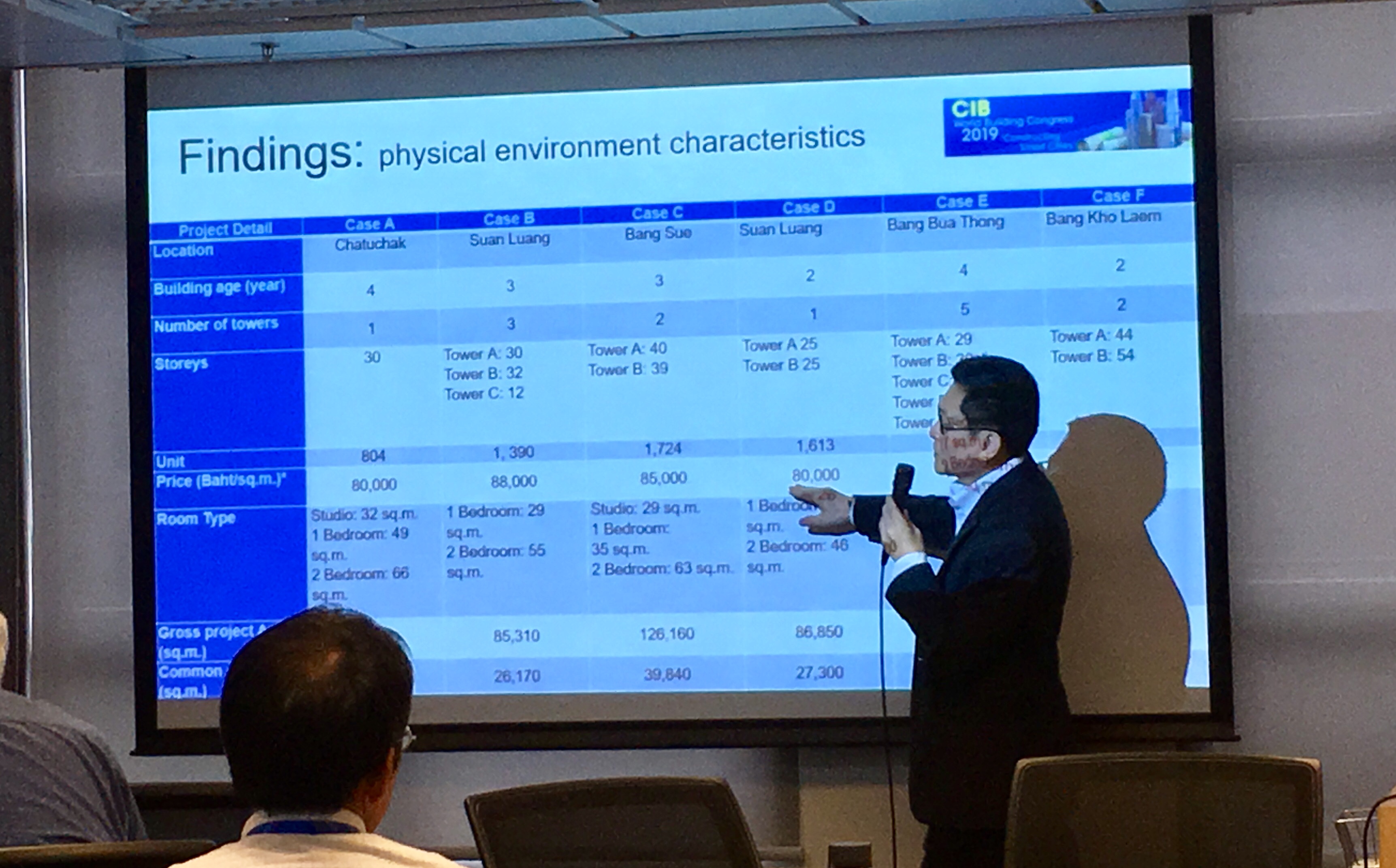 หัวหน้าหน่วยวิจัย FREM นำเสนองานวิจัยเรื่อง Impact of FM arrangement on occupant satisfaction: case studies of six multi-generational condominiums ในงานประชุมวิชาการนานาชาติ CIB World Building Congress 2019 Constructing Smart Cities Hong Kong